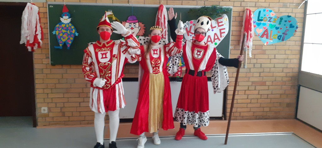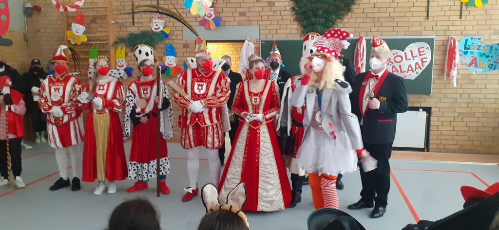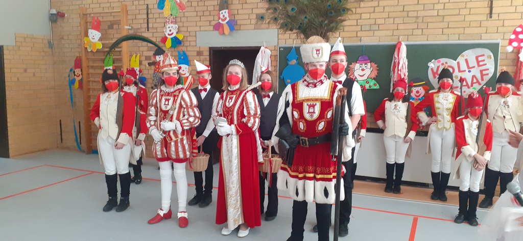Karneval und Corona? Geht das? Nichts ist unmöglich. Und so packte unser Organisationsteam die Sache an. Es entstand eine super Liveshow, die in allen Klassen übertragen wurde. Da wir in jeder Klasse einen Beamer haben wurde die Sendung aus der Turnhalle in alle Klassen übertragen. Die Klasse die auf der Bühne stand wurde nach ihrem Auftritt mit genügend Abstand zum Zuschauer und ging dann in ihre Klasse um weiter der Sitzung zu folgen. So wurden alle Klassen die einen Auftritt hatten durch die Sitzung "geschleust". Ein logistisches Meisterwerk das seines gleichen sucht. Respekt und Hut ab vor allen Akteuren!